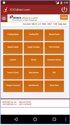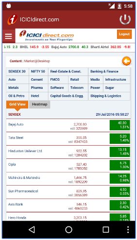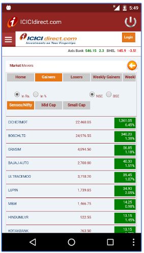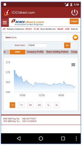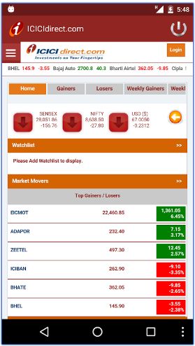 - जैस ही ग्राहक, आईसीआईसीआई डायरेक्ट मोबाइल ऐप की होम स्क्रीन पर लॉग इन करता है, उसे सूचियों और सेंसेक्स के बारे में नवीन जानकारी प्राप्त होती है और निफ्टी के साथ साथ, बाज़ार में सबसे अच्छा या ख़राब प्रदर्शन देने वाले शेयरों के बारे में भी जानकारी मिल पाती है । साथ में ग्राहक, मार्केट वाच में जुड़े शेयर के बारे में भी जान पाते हैं ।
