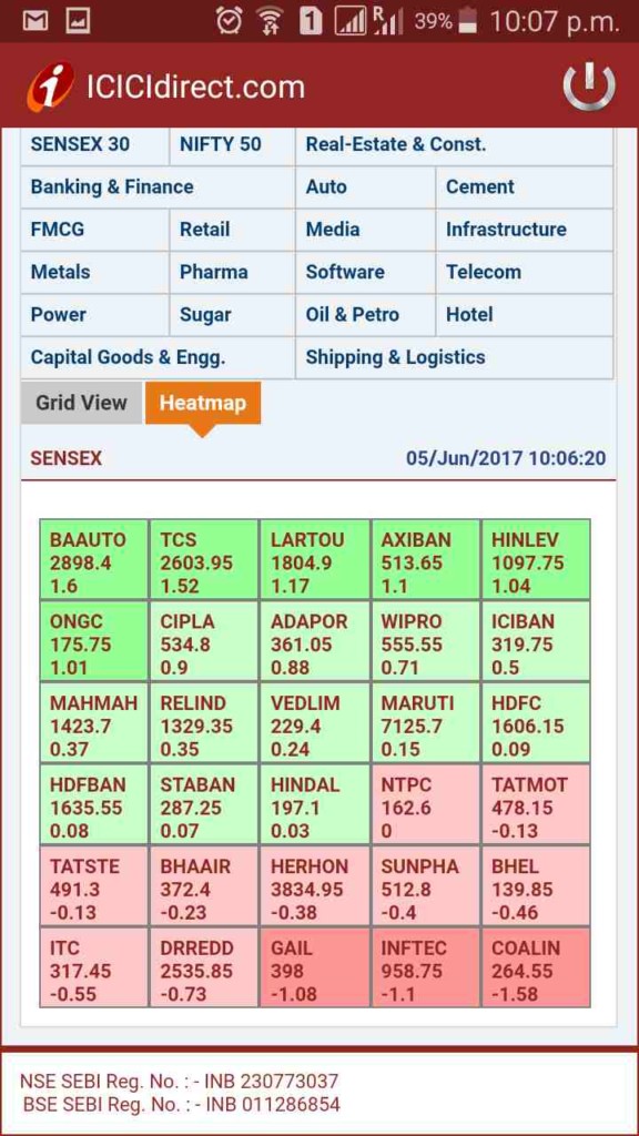 - ये मोबाइल ऐप अपने ग्राहकों को विभिन्न शेयरों को ‘हीटमैप सुविधा’ से देखने का भी विकल्प उपलब्ध कराता है । इस सुविधा में शेयर की बाज़ारी चाल के हिसाब से उसे रंगों के द्वारा दर्शाया जाता है । उदाहरण के तौर पर, हरे रंग का अर्थ है कि शेयर ने तेज़ी पकड़ी है और उसमे बढ़त हुई है और लाल रंग का अर्थ है कि उसके दामों में गिरावट आई है । इन रंगों को ग्राहक की प्रथिमकता के अनुसार कस्टमाइज किया जा सकता है ।