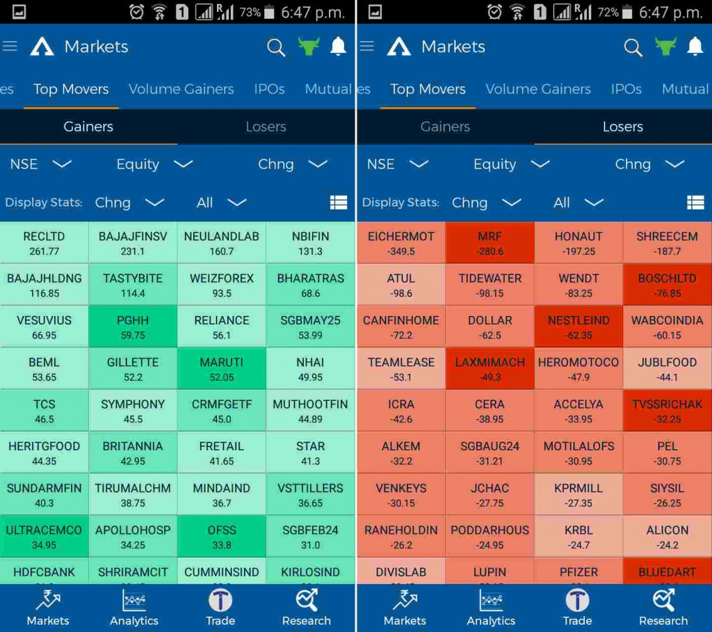 - इसके साथ साथ आप सर्वश्रेष्ठ लाभ देने वाले और सबसे ज्यादा घाटा पहुचने वाले शेयरों की जानकारी प्राप्त कर सकते हैं | इस सुविधा के माध्यम से आपको यह ज्ञात हो जाता है की किस शेयर ने पूरे दिन में सबसे ज्यादा फ़ायदा पहुचाया और किसने सबसे ज्यादा नुकसान |