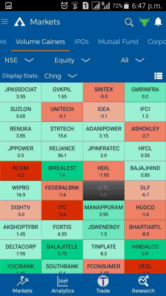 - इसके साथ में कार्वी ऑनलाइन मोबाइल ऐप आपको हीटमैप सुविधा भी उपलब्ध करता है जिसके उपयोग द्वारा आप बाज़ार में वास्तविक समय के सबसे लाभप्रद और हानि देने वाले शेयरों के बारे में जानकारी हासिल कर सकते हैं | इसे आप दोनों ही तरह, अर्थात दामों को और व्यापार की मात्रा को ध्यान में रखकर से इस्तेमाल कर सकते हैं |