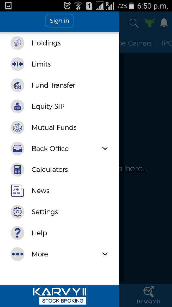 - इस मोबाइल ऐप की विषय सूची इस प्रकार दिखती है | इसमें अपनी शेयर सूची अर्थात होल्डिंग को जांचने का , शेयर खरीद बेच हेतु सीमा अर्थात लिमिट समझने का, म्यूच्यूअल फंड, बाज़ार की ख़बरें इत्यादि जानने का विकल्प उपलब्ध है | इसके बराबर में एक और विषय सूची उपलब्ध होती है जिसके माध्यम से आप बाज़ार की जानकारी, विश्लेषण, सौदे सम्बंधित जानकारी, इत्यादि प्राप्त कर सकते हैं |